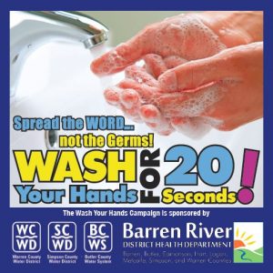 The Wash Your Hands campaign, is being launched today in-conjunction with Global Handwashing Day, to reinforce healthy habits within the community. The campaign is sponsored by Warren County Water District, Simpson County Water District, Butler County Water System and the Barren River District Health Department. This community wide Wash Your Hands campaign brings attention to proper handwashing in an effort to keep our community healthy.